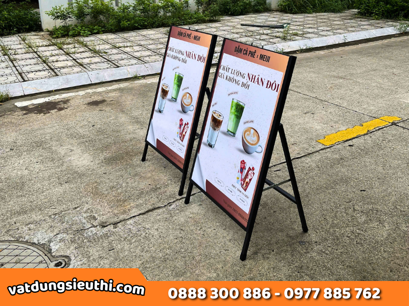 Với chất liệu sắt sơn tĩnh điện và trọng lượng ổn định, standee chữ A có thể đặt ngoài trời để quảng bá thương hiệu mà không lo hư hỏng nhanh chóng.