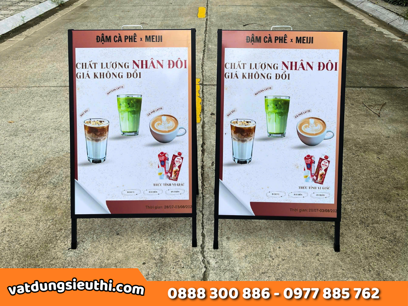 Standee chữ A thường được đặt ở lối vào để thông báo chương trình khuyến mãi, sản phẩm mới hoặc hướng dẫn khách hàng. Với kích thước 0.6 × 0.9m, nội dung hiển thị rõ ràng, dễ dàng tiếp cận người mua ngay từ cái nhìn đầu tiên.